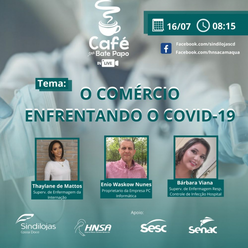 Dorneles. O Hospital Nossa Senhora Aparecida vai participar da Live Café Com Bate Papo do Sindilojas Costa Doce. A transmissão on line ocorre nesta quinta-feira (16), a partir das 8h15, na página do Facebook do HNSA. A live vai contar com a participação da Supervisora de Enfermagem do setor de internação do hospital, Thaylane de Mattos, da Supervisora de Enfermagem responsável pelo Controle de Infecção Hospital do HNSA, Bárbara Viana e do proprietário da PC Informática, Enio Waskow N