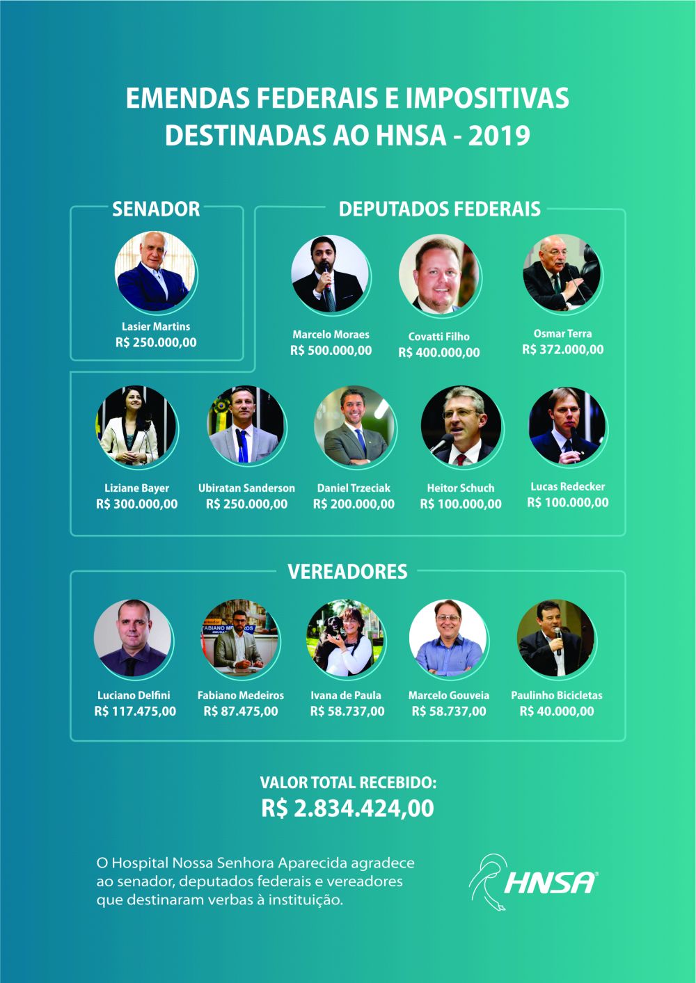 O Hospital Nossa Senhora Aparecida agradece ao Senador, Deputados Federais e Vereadores que destinaram verbas à Instituição.